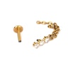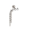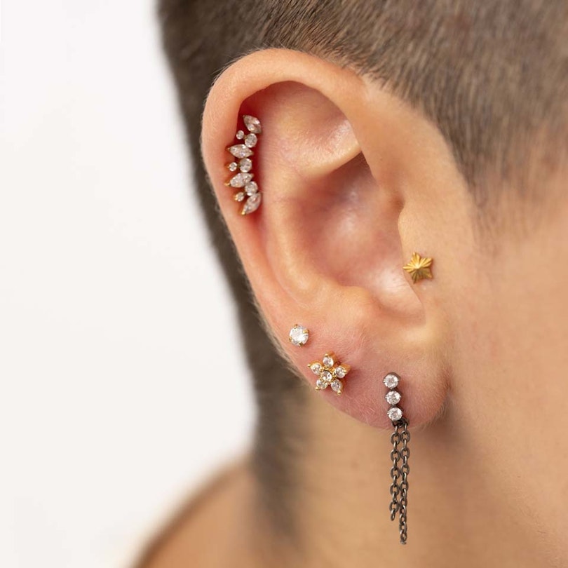 Este estiloso labret luce una hilera de tres piedras circonitas biseladas de las que cuelgan dos cadenas adheridas mediante un pequeño aro. Las cadenas tienen longitudes diferentes, creando un atrevido look asimétrico; la más larga mide 19 mm. La joya puede colocarse horizontalmente en el lóbulo, o bien verticalmente o en ángulo con otras joyas de tu oreja. Combínala a tu manera para conseguir el look ideal.
