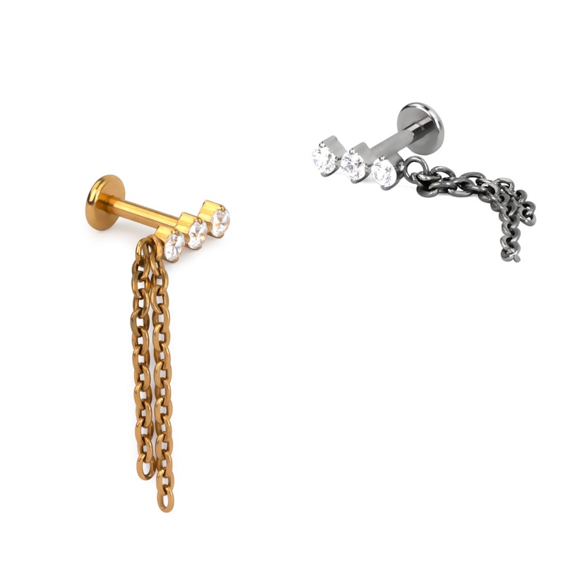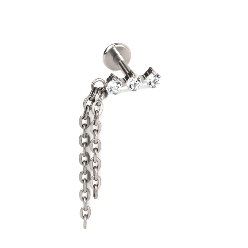 Nombre: Labret de titanio con trío de piedras y cadena doble colgante
