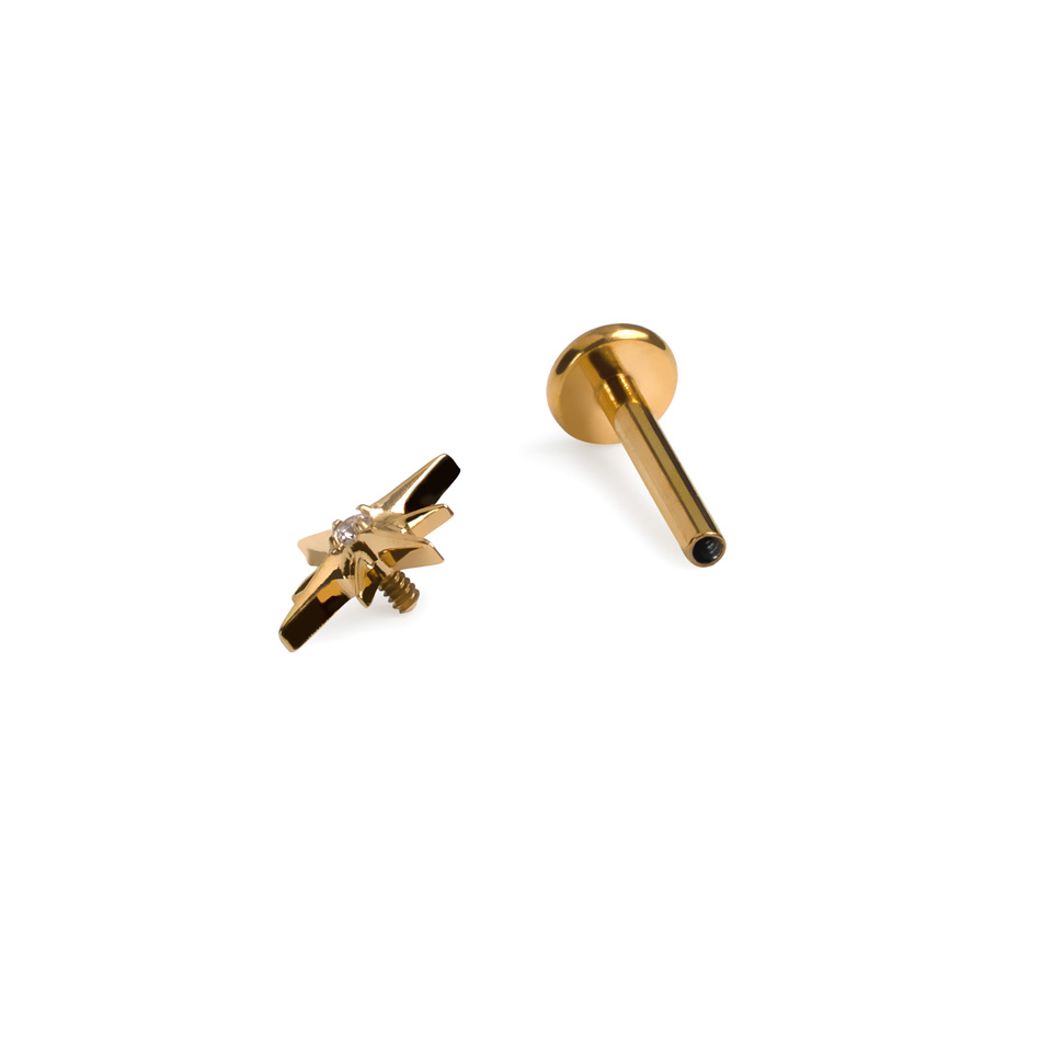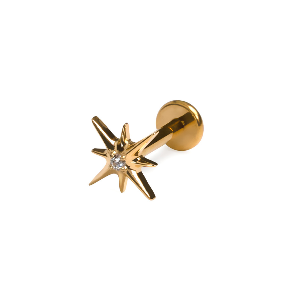 El labret de titanio en forma de estrella con piedra central está hecho para aquellos a quienes les gusta que sus joyas tengan un toque cósmico. Su diseño en forma de estrella enmarca una piedra central. Disponible en acabados dorado y plateado, es un detalle que destaca en cualquier combinación de pendientes.