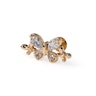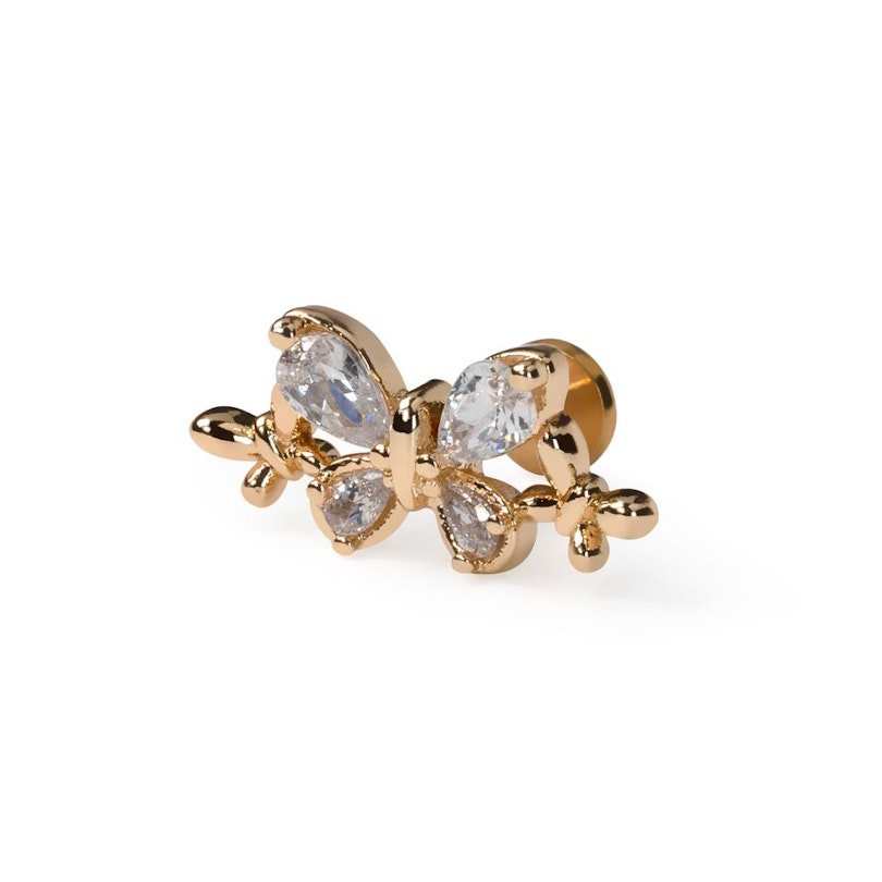 El labret de tres mariposas destaca por sus divertidos detalles. En el centro presenta una mariposa más grande, formada por piedras transparentes engastadas en garras, mientras que a cada lado luce una pequeña mariposa dorada, creando un delicado trío lleno de carácter.