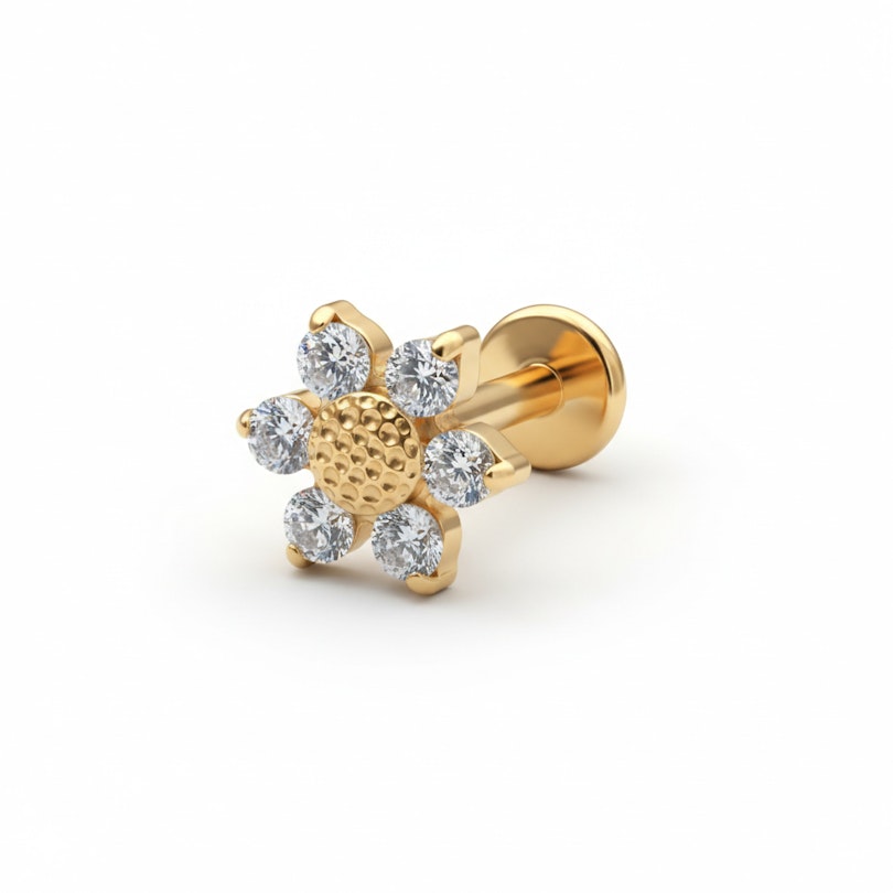 El labret margarita de titanio es un pequeño recordatorio de que no todos los días tienen que ser serios. Con un diseño floral de piedras engastadas en garras y un centro texturizado, disponible en acabados dorado y plateado, aporta el toque perfecto de encanto y diversión.