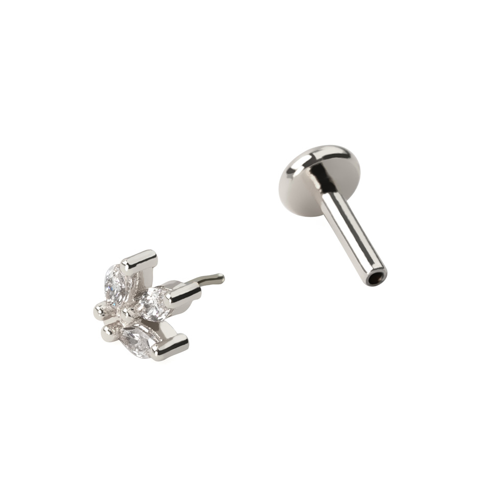 La parte frontal del labret consta de tres pequeños brillantes. Tienen un corte llamado marquesa, un tipo de forma ovalada con extremos puntiagudos.