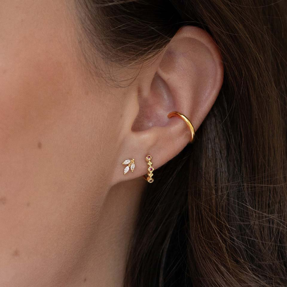 Puedes elegir entre tres colores y dos longitudes diferentes. Está disponible en una longitud de 8 mm o en una versión más corta de 6 mm. Ambos modelos tienen un grosor de barra de 1,2 mm. La flor mide 6,5 mm de alto. Los colores disponibles son los que puedes ver en la imagen superior: plateado, dorado y oro rosado. La parte frontal es de latón y la barra está hecha de acero quirúrgico.