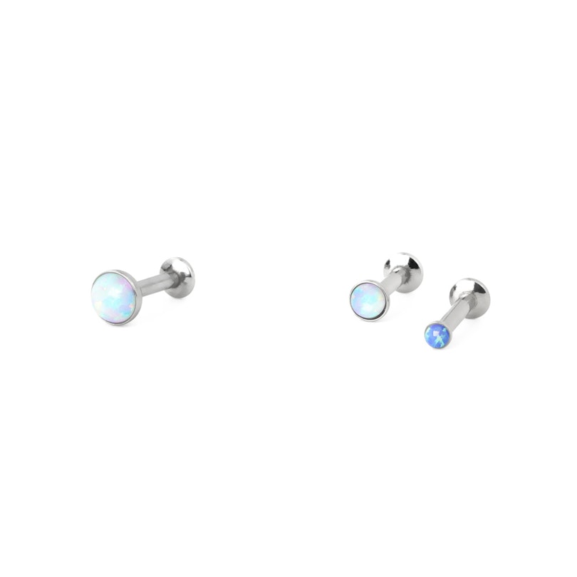 El labret está disponible en varias longitudes y en los dos colores de piedra que puedes ver en las fotos. Cuando elijas la longitud que quieras, también deberás elegir el tamaño del ópalo entre tres opciones.
