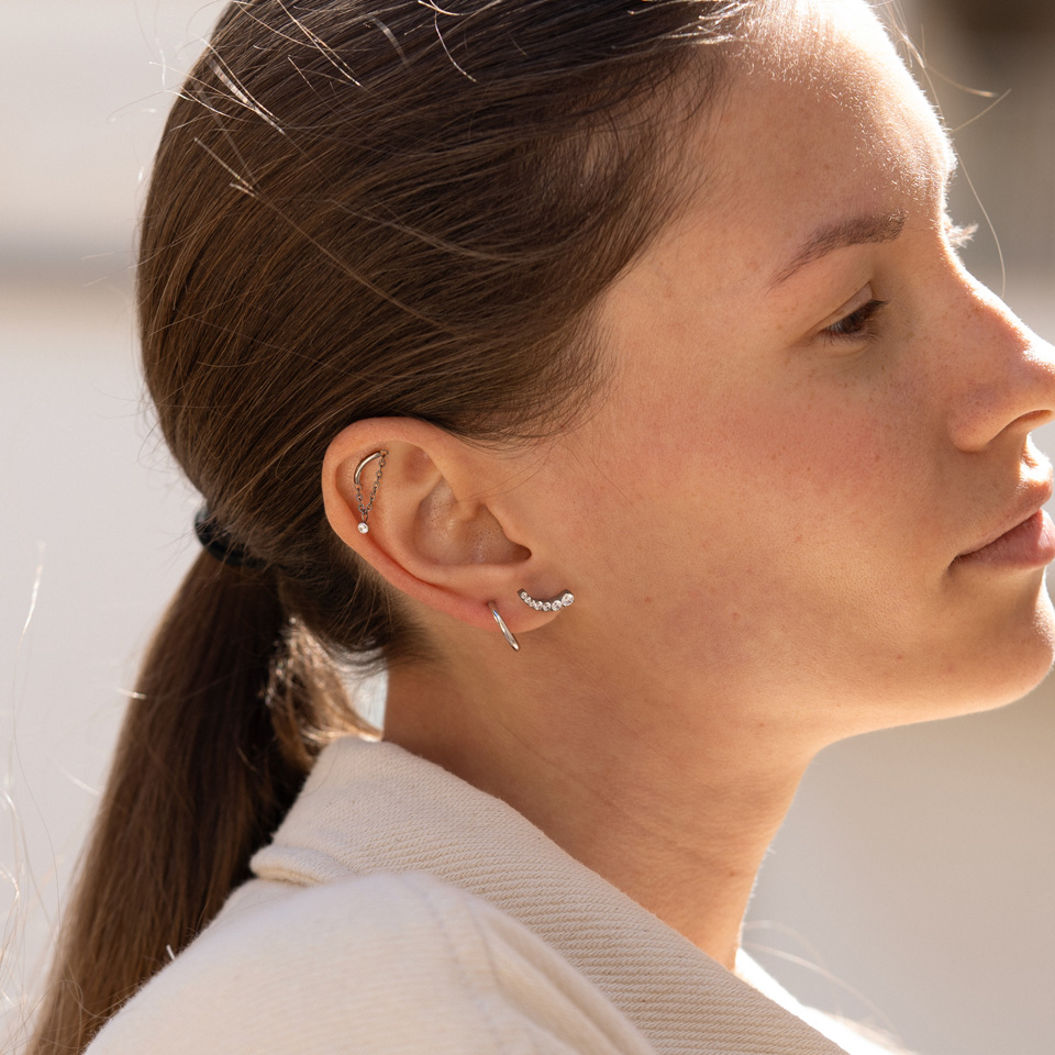 El labret incluye un práctico sistema push-in que hace que cambiar de joya resulte facilísimo. Puedes llevar labrets en varios piercings, como de los labios y la mayoría de piercings en las orejas. El diseño curvado luce especialmente bien en lóbulos y en el piercing helix, ya que sigue la forma de la oreja.