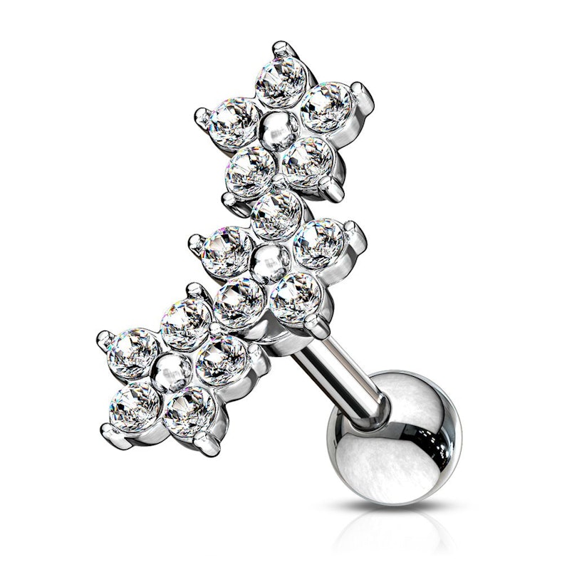 Esta joya es perfecta para el piercing en la hélice, como puedes ver en la foto. Las tres flores que componen la joya crean un arco sutil que acompaña la forma del borde de la oreja. La parte de las flores mide aproximadamente 12 mm de arriba a abajo, que consiste en tres flores de cinco pétalos cada una. Las flores están disponibles en tres colores diferentes. Las tres variantes son exactamente iguales, excepto el color de las flores.