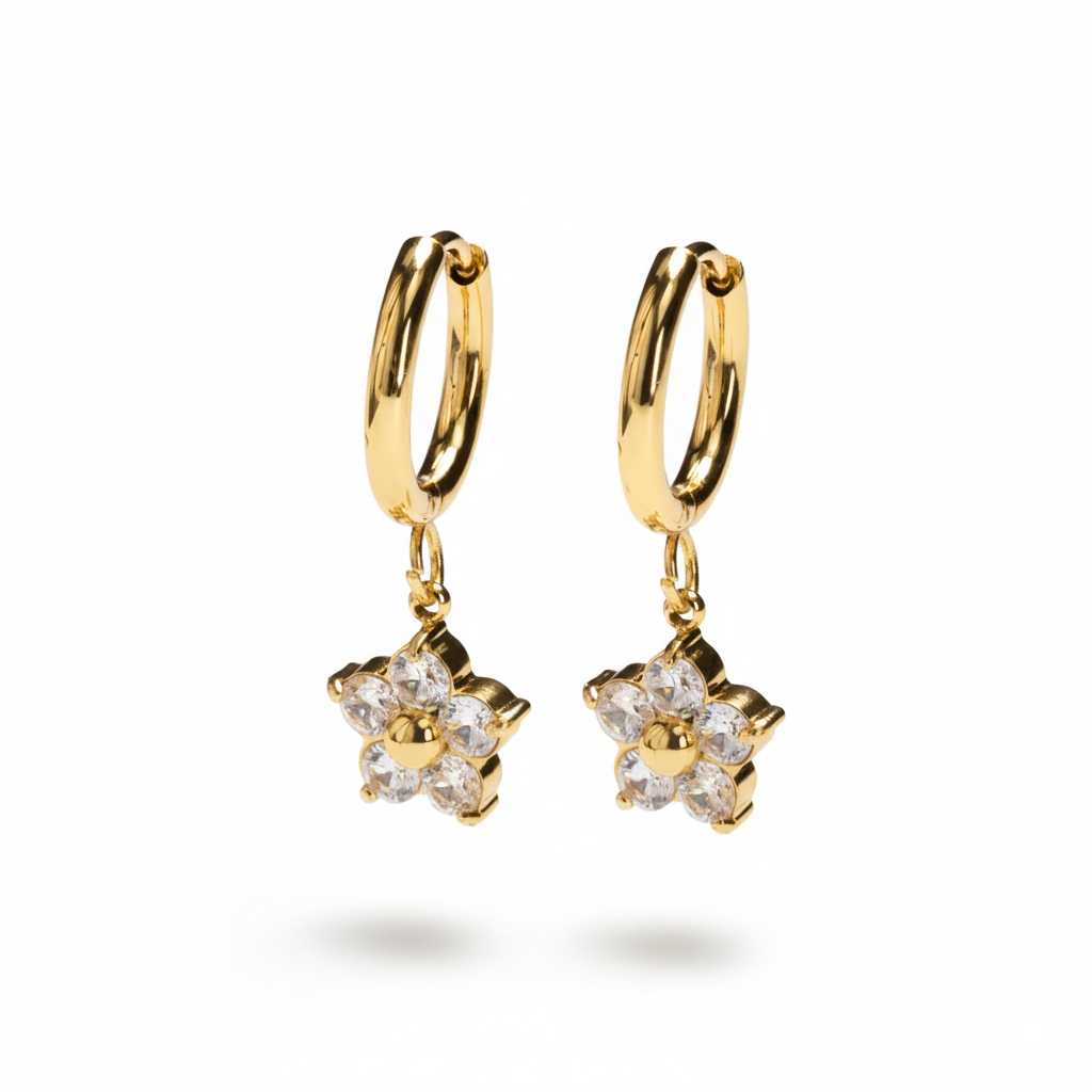 El par de aros con flor colgante está hecho para llamar la atención. Cada aro lleva un pequeño colgante de flor con piedras en un engaste de garras cuidado, aportando el detalle justo para captar miradas cuando caminas, pues son ese tipo de pendientes por los que siempre te preguntan. Gracias al cierre de bisagra, son fáciles de llevar y disfrutar. Disponibles en colores dorado y plateado.