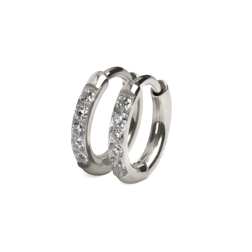Descubre tus nuevas joyas necesarias: estos aros huggie de titanio con piedras de circonita cúbica. Hechos de titanio de alta calidad, son duraderos, completamente hipoalergénicos y ligeros para llevarlos cómodamente todo el día. Las piedras brillantes de circonita cúbica añaden a la joya un destello cautivador, y son waterproof de verdad, por lo que nunca te las tendrás que quitar. Se venden como un par, y son el perfecto mix entre el lujo y el día a día.
