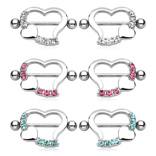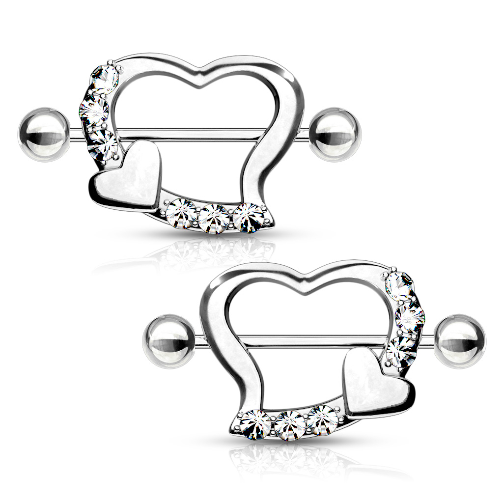 Este set de 2 joyas incluye 2 fabulosos escudos para tus piercings en el pezón, en forma de corazón y con 6 pequeñas piedras brillantes a un lado, además de un segundo corazón más pequeño.