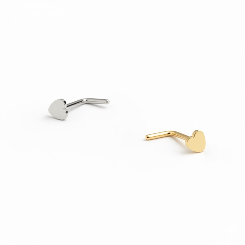 Diseñado para piercings en la nariz, este pendiente en forma de corazón es discretito, pero nunca pasa desapercibido. Disponible en acabados dorado y plateado.