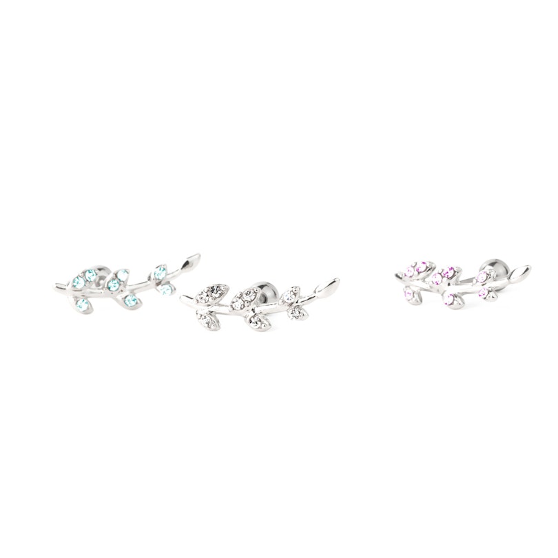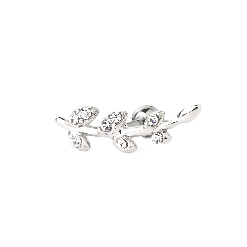 Esta joya tiene un grosor de barra de 1,2 mm y su diseño tiene forma de rama que se dobla ligeramente hacia un lado. La rama tiene hojas a ambos lados, y en cada hoja hay un pequeño brillante, que puede ser de tres colores distintos. Puedes elegir la joya con brillantes de color blanco, turquesa o rosa.