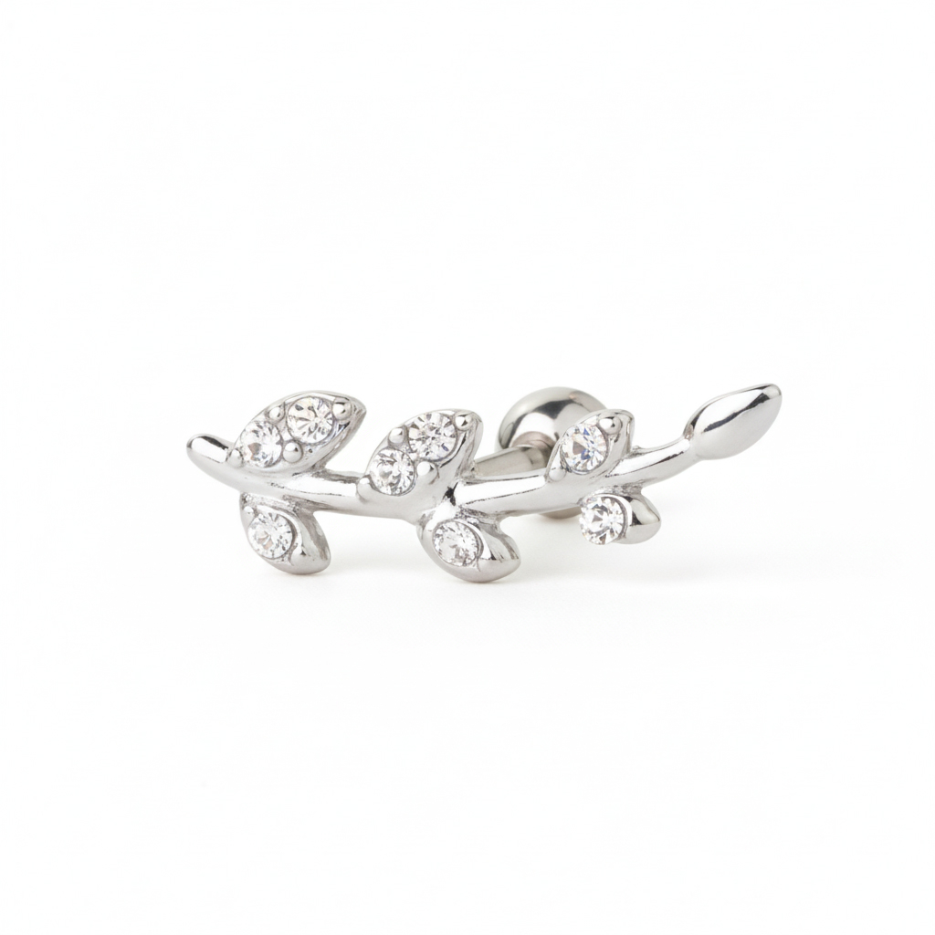 Esta joya tiene un grosor de barra de 1,2 mm y su diseño tiene forma de rama que se dobla ligeramente hacia un lado. La rama tiene hojas a ambos lados, y en cada hoja hay un pequeño brillante, que puede ser de tres colores distintos. Puedes elegir la joya con brillantes de color blanco, turquesa o rosa.