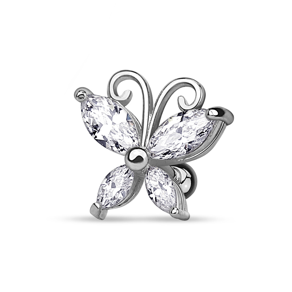 Es dificil no enamorarse de las adorables mariposas, especialmente cuando están tan cuidadosamente diseñadas, como la de esta preciosa joya para tu oreja. La mariposa de esta joya tiene unas bonitas y grandes alas, que como puedes ver, consisten en brillantes oblongos. Los brillantes de las alas superiores son un poco mayores que los inferiores, como las mariposas de verdad.