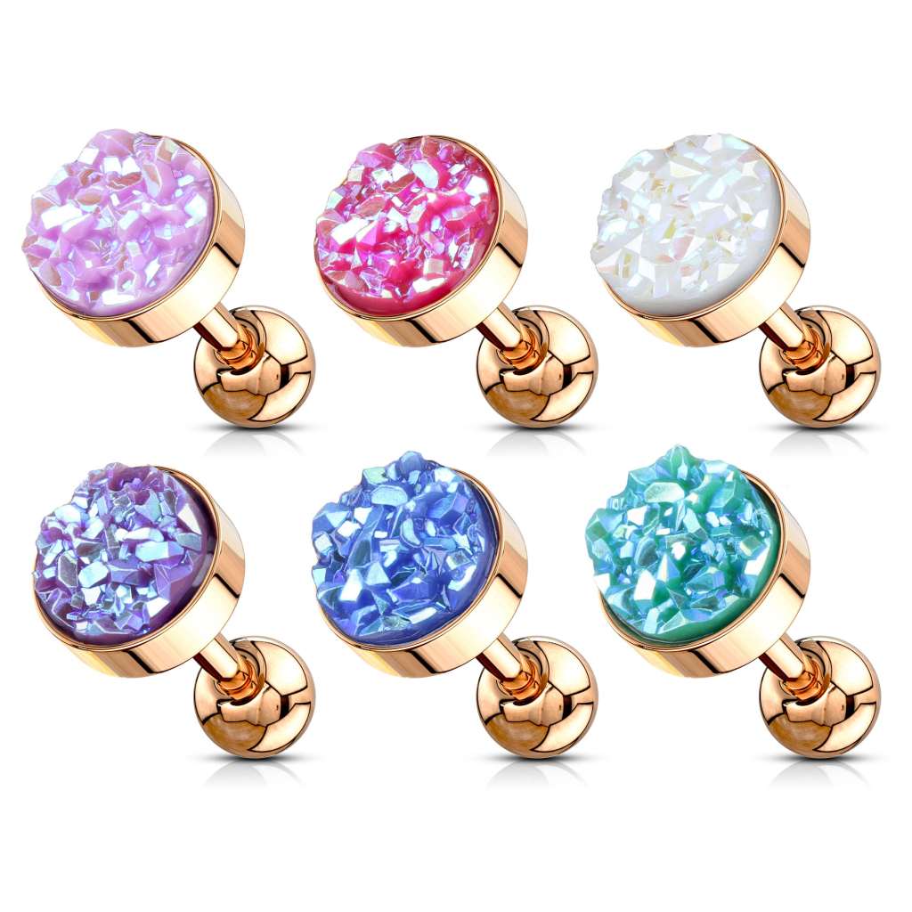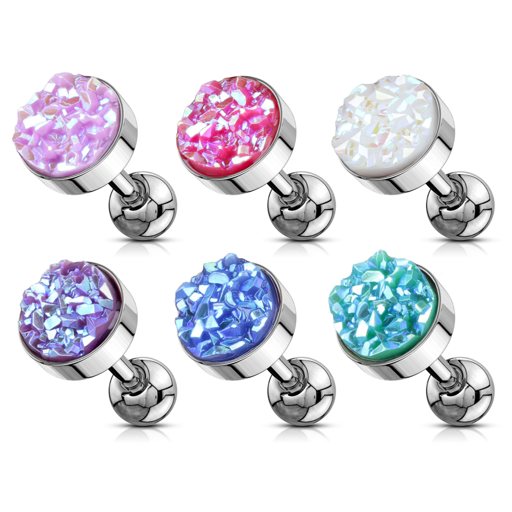 Te presentamos una pequeña y discreta joya para el piercing en la oreja, pero con gran personalidad. Esta joya mide 6 mm de longitud, y la parte superior de la joya tiene un aspecto totalmente espectacular. Su bola superior está hecha de piedra drusa, la cual es una formación mineral con cristales de uno o varios tipos de minerales. Estas formaciones pueden ser de varios colores, de tantos como puedas imaginarte. En cuanto esta joya, te presentamos seis versiones, entre ellos el color blanco. Lo mejor de todo es que los cristales reflejan la luz, por lo que el efecto es espectacular.