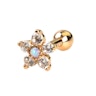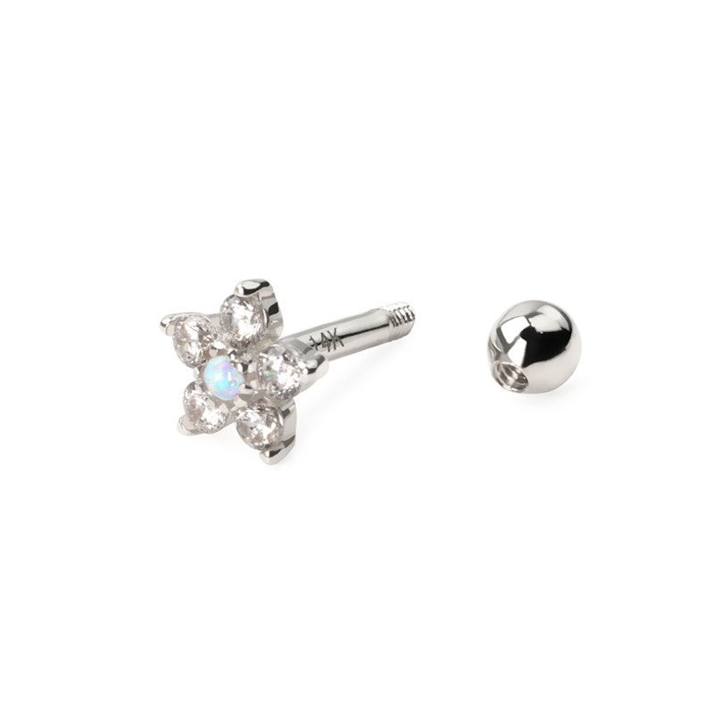 La parte frontal presenta una preciosa flor con una fantástica opalita sintética en el centro, rodeada de 5 brillantes transparentes. Estos brillantes ensalzan la belleza de la opalita central y hacen que el efecto de la joya sea todavía más sensacional. Se trata de una joya de lo más espectacular, que sin duda decorará tu oreja de la mejor manera, sea donde sea que tengas tu piercing. En la parte posterior, la joya cuenta con una pequeña bola de cierre de 3 mm que se puede enroscar y desenroscar.