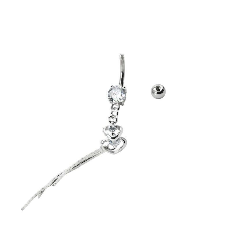 Una joya para el piercing en el ombligo con pequeños brillantes, y con dos dulces corazones colgantes.