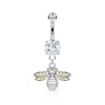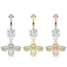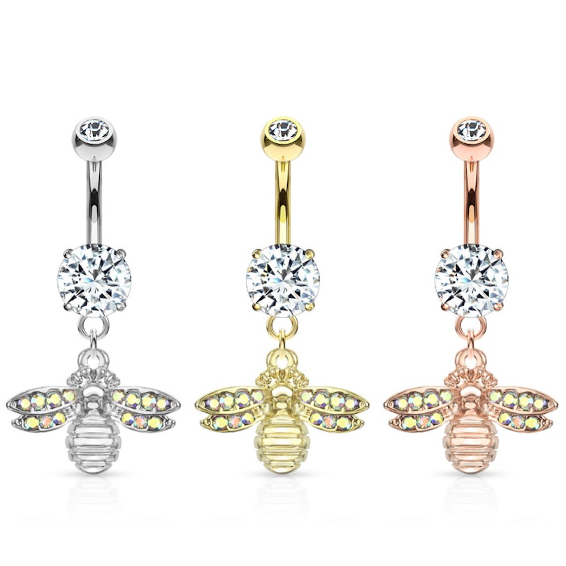 El piercing para el ombligo que ves en la imagen tiene una bonita abejita que cuelga del colgante. La abeja está hecha de latón, y en sus alas encontrarás varios brillantes que reflejan muchos colores del arco iris. Lo llamamos aurora boreal, porque nos recuerda a las impresionantes luces del norte. La abeja cuelga de una barra curvada de 10 mm de largo y un grosor de 1.6 mm. Es de acero quirúrgico, como la mayoría de piercings para el ombligo que encontrarás en nuestra tienda.