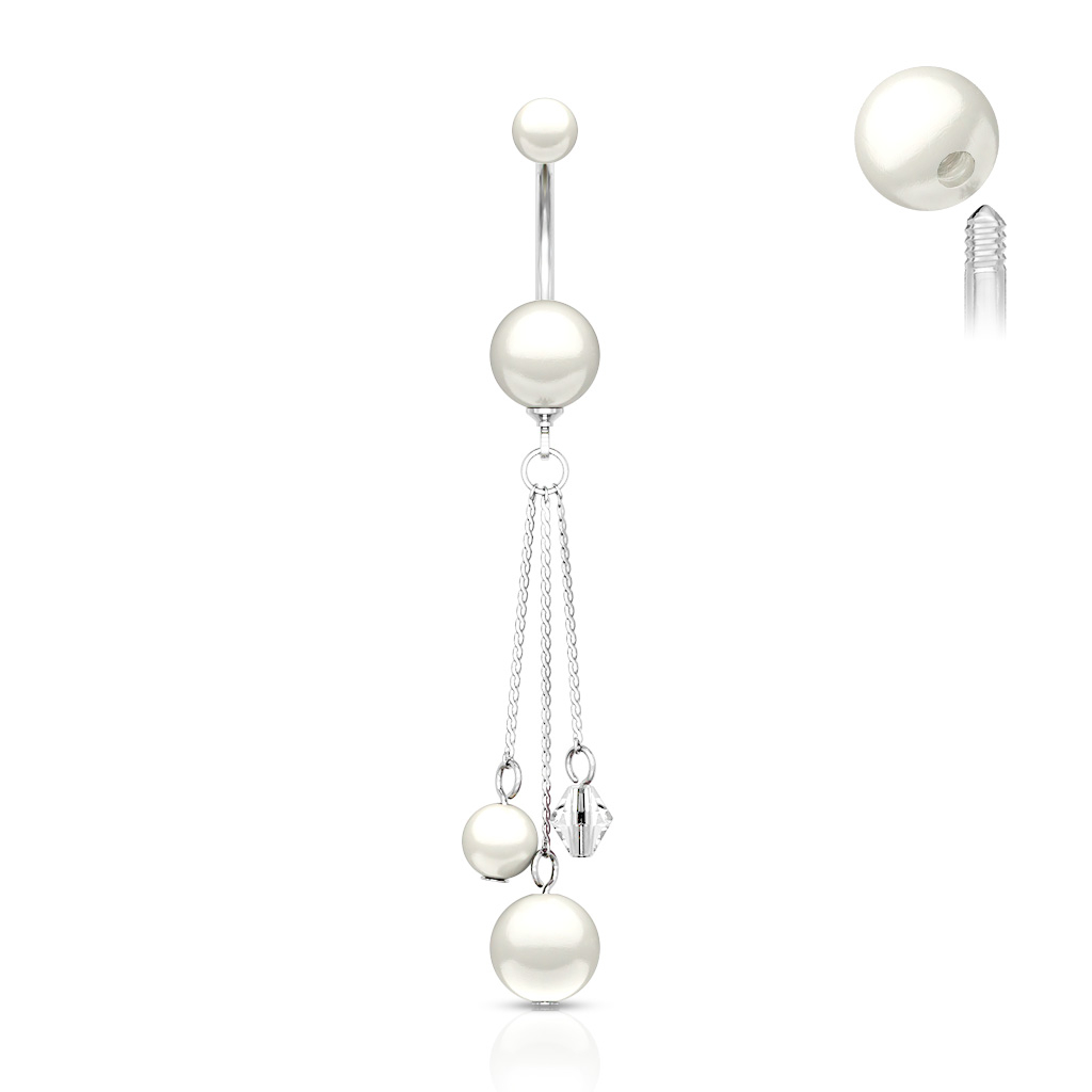 Descubre este dulce piercing para el ombligo hecho de acero quirúrgico con perlas de acrílico. Luce un estilo coqueto y clásico con tres colgantes de cadena. Tres cadenas de diferentes longitudes cuelgan desde la perla inferior en un diseño asimétrico. Una de las bolas tiene forma de diamante, y todas las bolas son del mismo color.