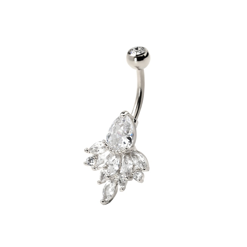 Esta joya para el ombligo es simplemente preciosa. Para empezar, tiene una barra curvada de 10 mm de longitud y una bola superior con un brillante de color blanco. Pero si la miras más de cerca, verás que tiene varios brillantes oblongos que se sostienen de un brillante mayor en forma de gota; todos ellos tallados como si fueran diamantes, de modo que la luz puede reflejar en ellos desde muchos ángulos distintos. Los brillantes inferiores están distribuidos en tres filas distintas, que acaban con un brillante oblongo por la parte inferior.