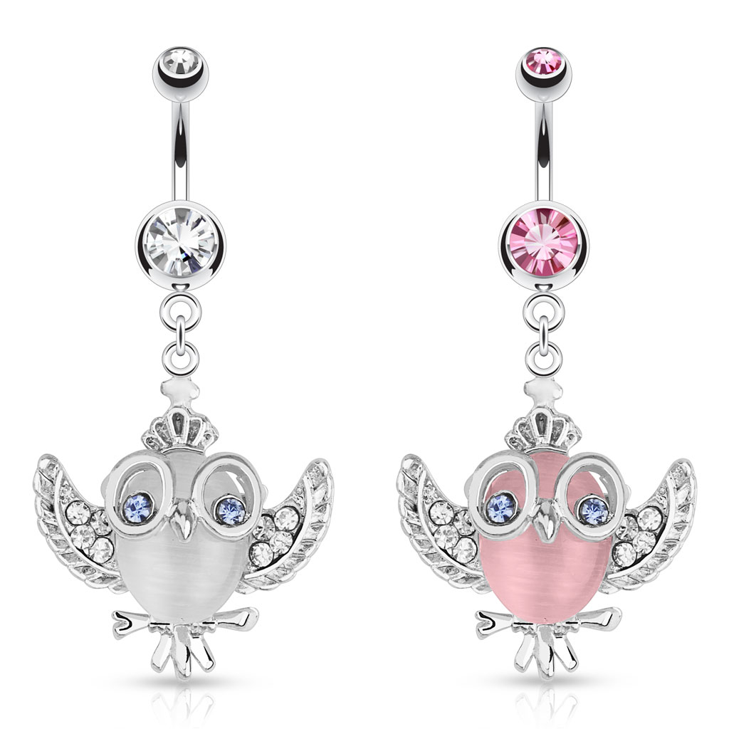 No encontrarás nada más dulce y delicado que esta bonita joya para el piercing en el ombligo con un gracioso búho en su colgante. Está hecha en acero quirúrgico, y tiene una barra de 10 mm, cuyas bolas superior e inferior están decoradas con bonitos brillantes del color que tú elijas.