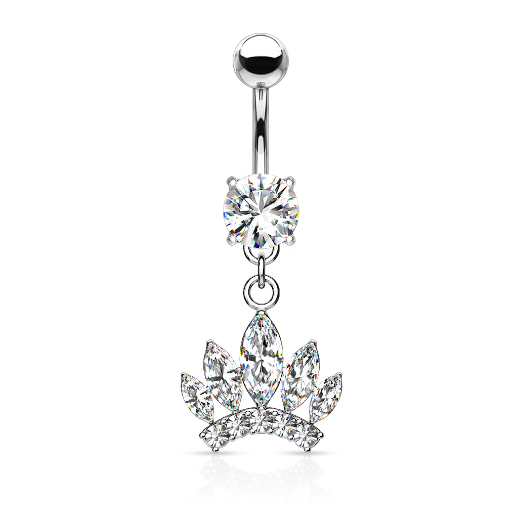 Conviértete en una princesa por un día o por todo el tiempo que quieras con esta súper dulce joya para el piercing en el ombligo, con una corona con brillantes en su colgante. Esta femenina corona está hecha de brillantes: la parte superior de la corona está formada por cinco brillantes oblongos, siendo el del centro el más largo y el de los extremos los más cortos. Además de los cinco brillantes, encontrarás también una pequeña "banda" de brillantes redondos en la parte inferior de la corona.
