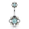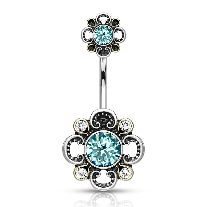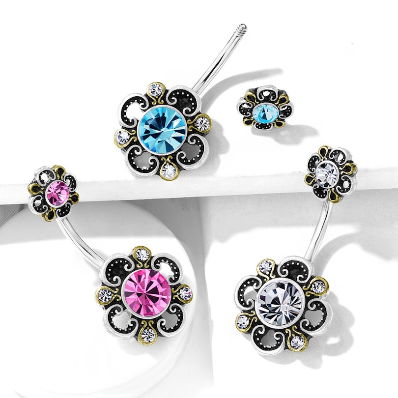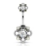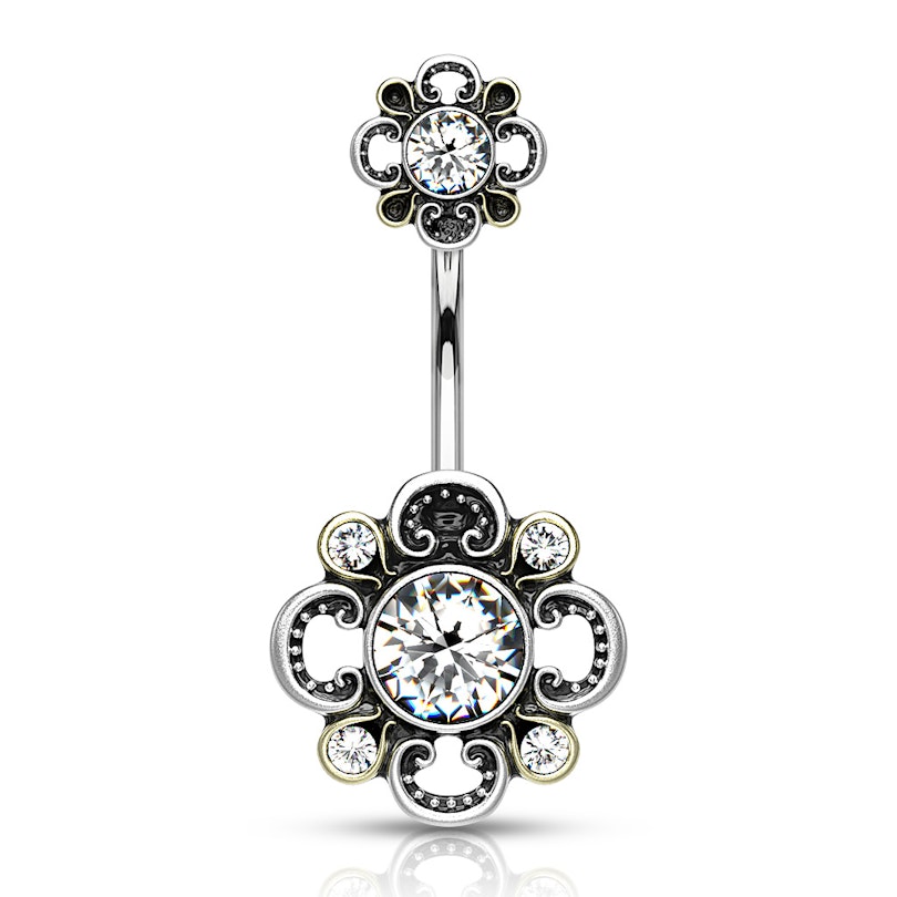 Piercing para el ombligo con flor de filigrana y hojas caladas empedradas