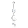 Este piercing para el ombligo tiene dos de las creaciones más importantes del universo: una luna y una estrella. La estrella está colocada en el arco interno de la luna, en una posición que le permite observar el resto del universo. Debajo de la medialuna cuelgan dos colgantes con un pequeño brillante al final.