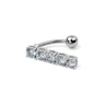 En cambio, la joya de este modelo no tiene una bola superior, sino que en vez de eso tiene un bonito colgante, que empieza donde debería estar la bola superior. El colgante contiene 5 brillantes claros, que se sostienen con la ayuda de 4 puntos cada uno. Todos ellos se asientan en una estructura articulada, por lo que se pueden mover, sin que se puedan doblar hacia atrás. Esta estructura, a su vez está unida a la barra de la joya.