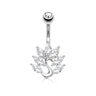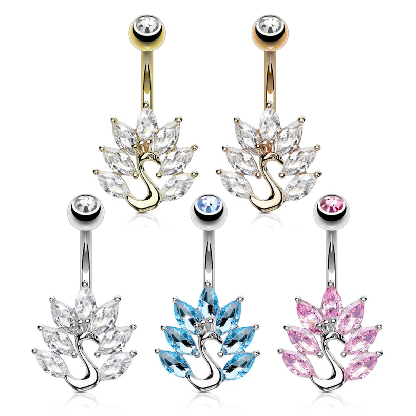 Esta joya para el piercing en el ombligo que ves en la fotografía representa un bonito pavo real. El pavo real desplega sus alas en una competición para atraer a la hembra con su belleza; en el caso de esta joya, las alas están representadas por fantásticas circonitas de forma oblonga. En la naturaleza cada macho tiene entre 100 y 150 plumas, mientras que en esta joya su cola se compone de siete circonitas.