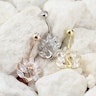 El cuerpo de esta joya está hecho de latón, el cual posteriormente ha sido chapado en rodio u oro. El color que elijas será el mismo en el cuerpo del animal que en la estructura y en la bola superior de la joya. Si eliges la versión plateada del cuerpo, podrás elegir entre varios colores de brillantes; en cambio si quieres que la joya en color dorado u oro rosa, los brillantes serán de color blanco.