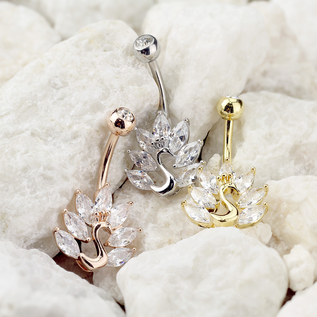 Esta joya para el piercing en el ombligo que ves en la fotografía representa un bonito pavo real. El pavo real desplega sus alas en una competición para atraer a la hembra con su belleza; en el caso de esta joya, las alas están representadas por fantásticas circonitas de forma oblonga. En la naturaleza cada macho tiene entre 100 y 150 plumas, mientras que en esta joya su cola se compone de siete circonitas.