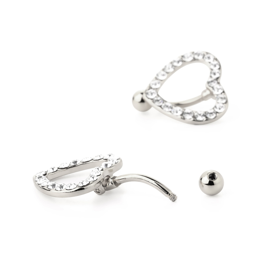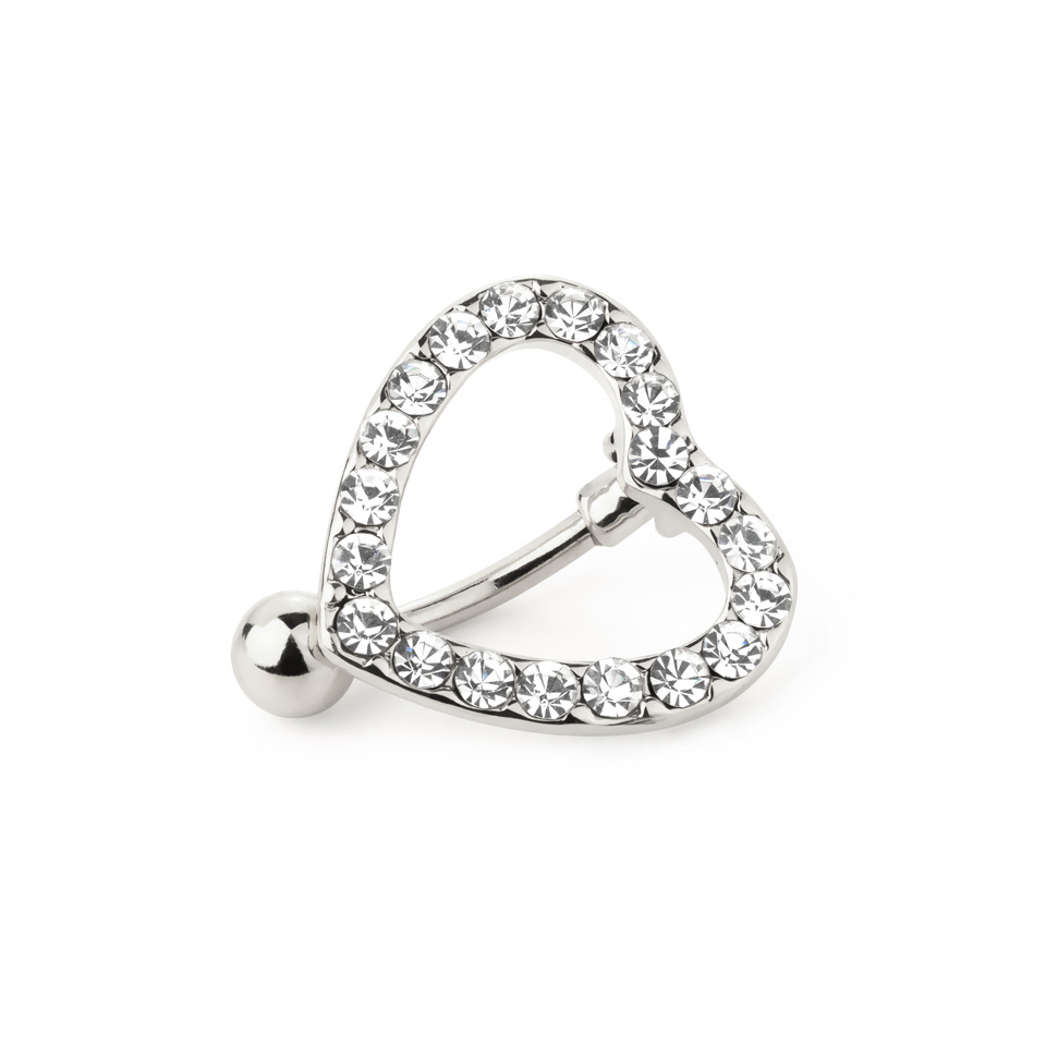 Esta joya está hecha en acero quirúrgico, y se ajustará perfectamente a tu perforación. El gran contorno del corazón está repleto de muchísimos brillantes, sujetos a la joya por medio de pequeños puntos.
