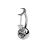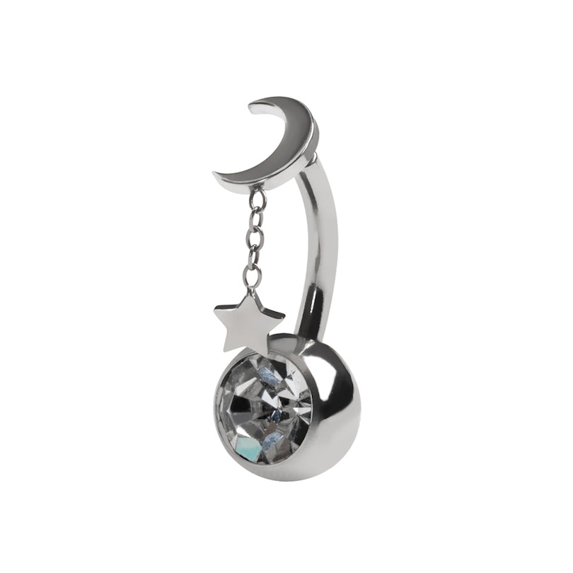 Este piercing para el ombligo de titanio luce una luna y una estrella colgante en la parte superior, que parecen flotar en el piercing. La bola inferior incluye una piedra circonita cúbica biselada que le da una chispa de brillo.