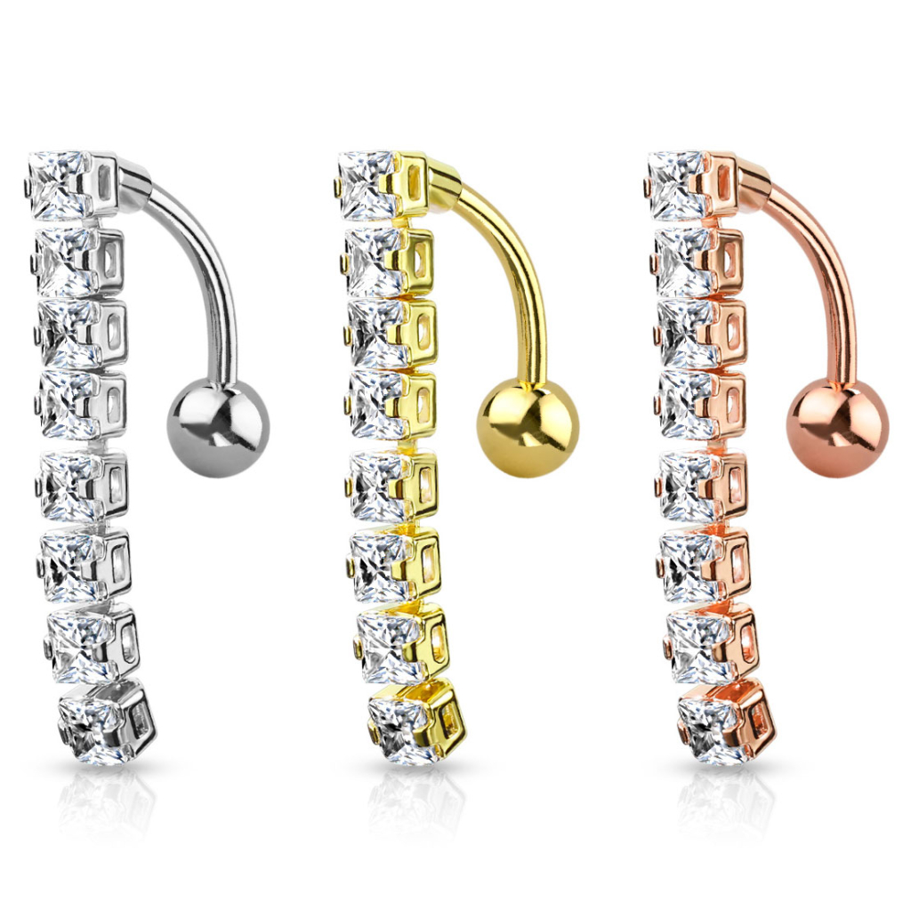 La joya que ves en la foto consiste en una barra curvada de acero quirúrgico. En la parte inferior hay una bola que habría sido la bola superior de una joya tradicional. No obstante, como esta es una joya invertida, la bola superior está debajo. Y el colgante, que normalmente va debajo, está arriba. Esta característica de las joyas invertidas hace que sea perfecta para la gente con el piercing en la parte inferior del ombligo. De todas formas, también se puede usar en un piercing normal. En ese caso, los brillantes colgantes quedarán por encima, tapando la barra, la bola y el ombligo.
