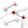 Esta barra con rosca externa de acero quirúrgico de 14 mm de longitud por 1,6 mm de grosor trae en cada extremo una cuenta de latón revestida en forma de corona. Puedes elegir el color de la corona entre tres bonitas y clásicas opciones. Debajo de las coronas hay un brillante en forma de corazón que también viene en distintos colores. Independientemente de los colores que elijas, la barra de acero quirúrgico siempre vendrá en su característico color plateado brillante.