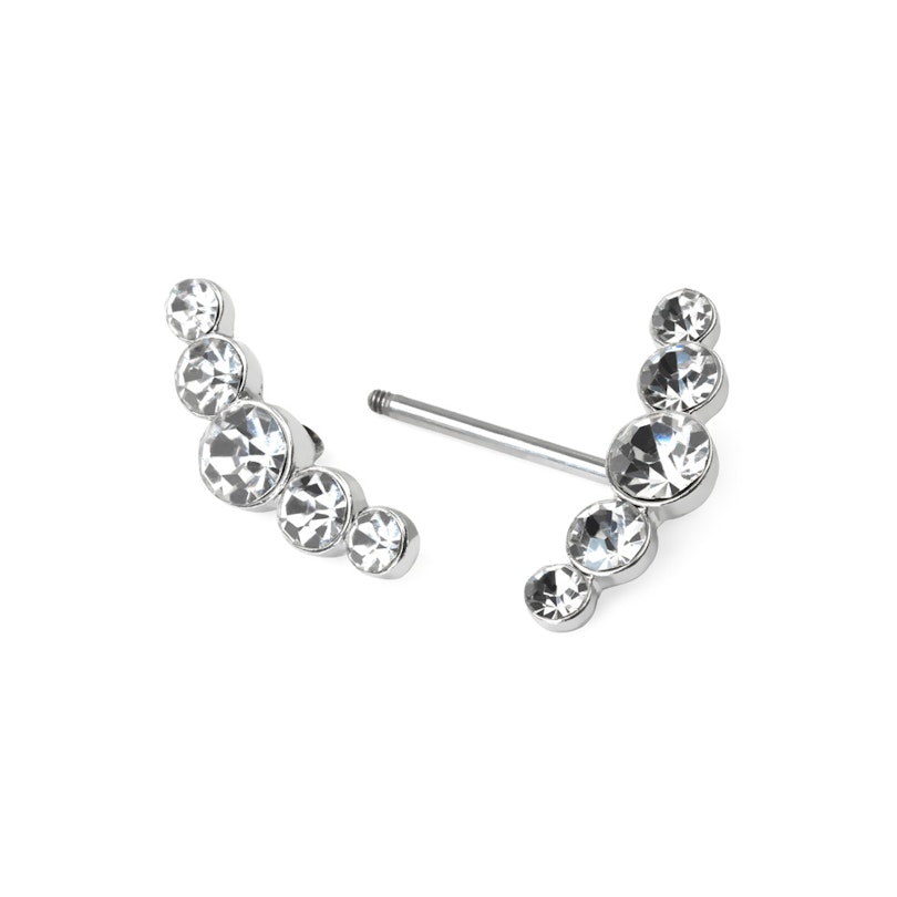 Este piercing para el pezón consiste en una barra recta y un arco vertical de brillantes a cada lado. El brillante de en medio es más grande, y los demás se van haciendo más pequeños hacia los extremos. Las filas de brillantes están ligeramente curvadas, como arcos que rodean el pezón casi por completo.