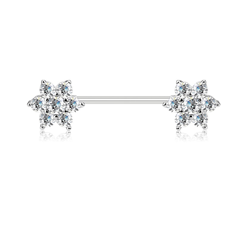 Bonita y elegante, esta joya para el piercing en el pezón tiene las flores más bonitas en cada uno de sus extremos.