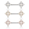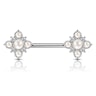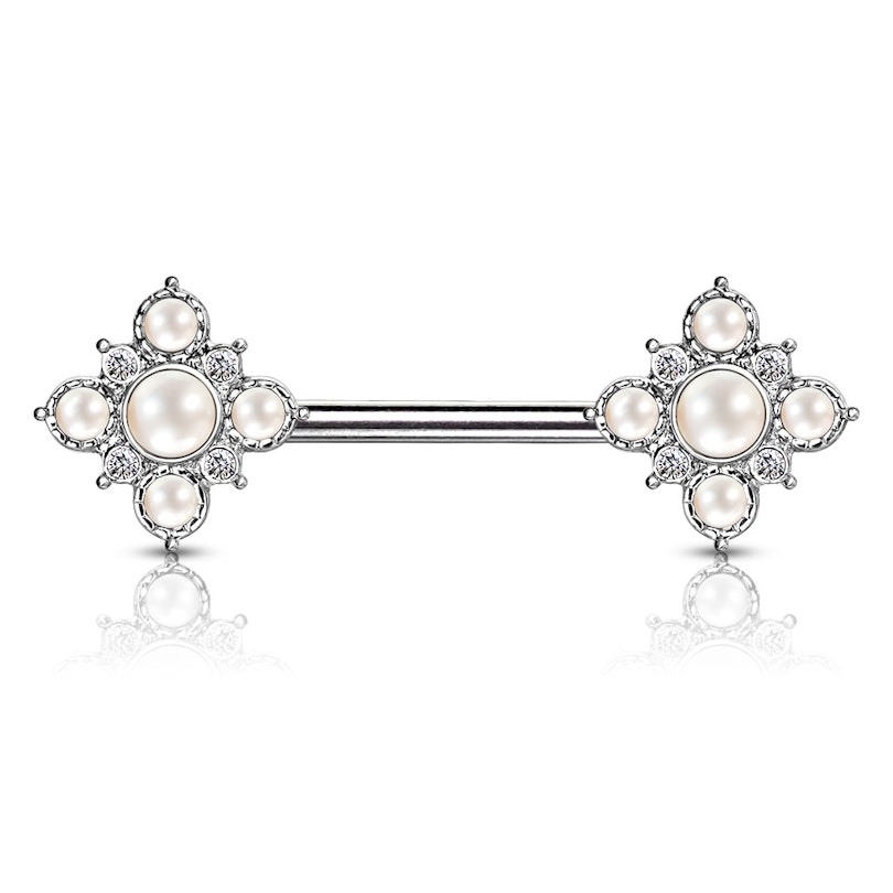 La barra que ves en la imagen es para ti si tienes un piercing en el pezón, o en ambos pezones. La joya consiste en una barra de acero quirúrgico de 12 mm de largo entre las flores. Si son flores o no lo dejamos a tu elección, pero con un poco de imaginación podrás ver la perla más grande como el centro y cuatro perlas más pequeñas como los pétalos de una flor. Entre ellos hay cuatro pequeños cristales que le dan a la joya un toque precioso.