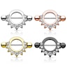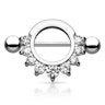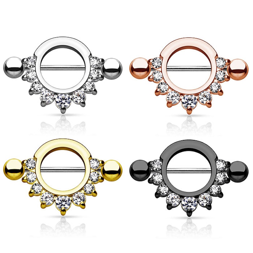 Ha llegado el momento de darle un pequeño capricho a tu piercing en el pezón con esta bellísima joya. Este escudo para el pezón contiene una barra que atraviesa este aro por la parte posterior. En la parte frontal del aro se encuentran nueve bonitos brillantes, que componen una media luna en la parte inferior.
