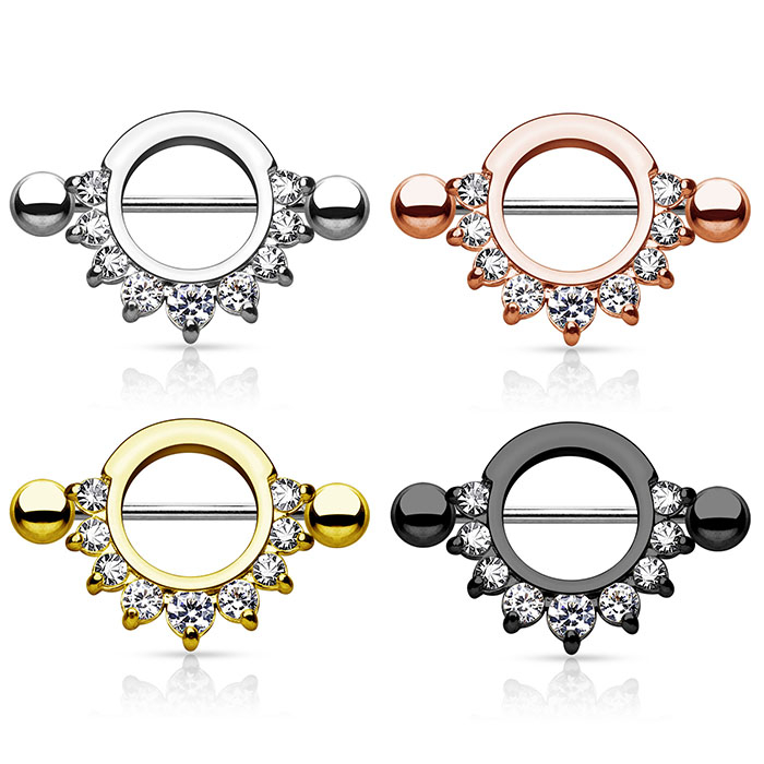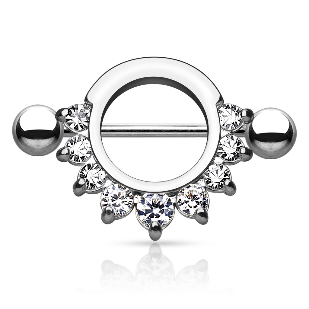 Ha llegado el momento de darle un pequeño capricho a tu piercing en el pezón con esta bellísima joya. Este escudo para el pezón contiene una barra que atraviesa este aro por la parte posterior. En la parte frontal del aro se encuentran nueve bonitos brillantes, que componen una media luna en la parte inferior.