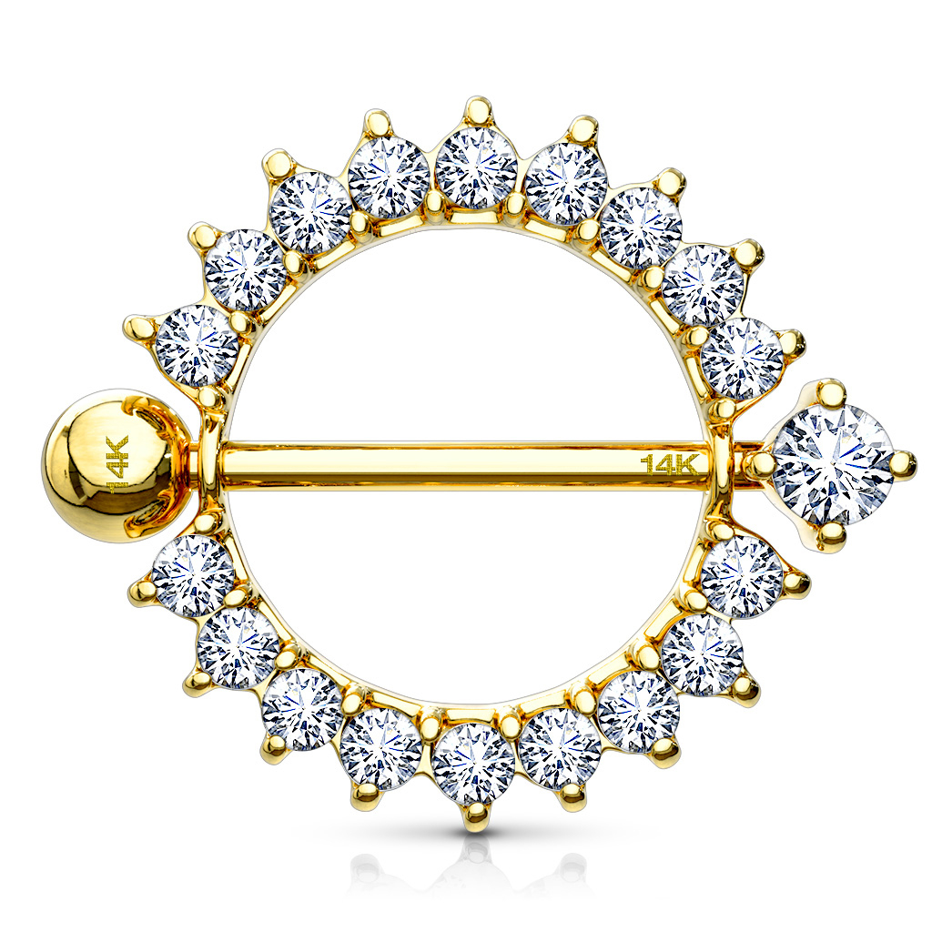 ¿Necesitas una joya exclusiva para tu piercing en el pezón? Ahora tienes la posibilidad de decorar tu pezón con una joya hecha en oro puro de 14 quilates, con bonitos brillantes de color blanco a lo largo de su canto. Esta magnífica joya parece un pequeño sol, gracias a sus numerosos brillantes, que brillan de un modo inigualable. Cada uno de los brillantes está incrustado en la joya (no pegados).