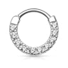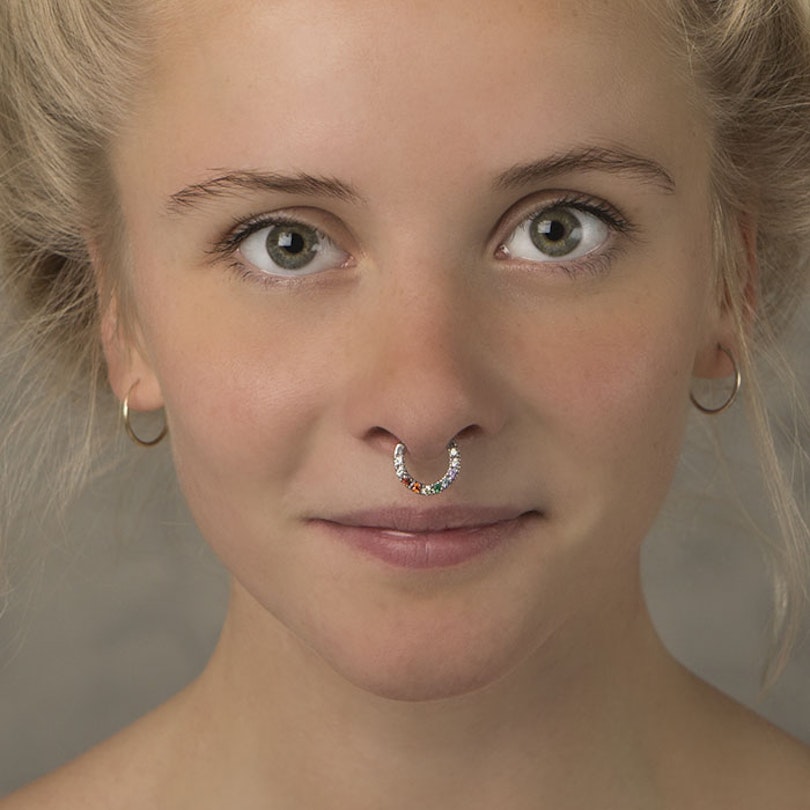 Si estás buscando una nueva joya, bonita y elegante, para tu piercing en el septum, aquí tenemos la joya perfecta. Este maravilloso pendiente tiene un diseño clásico que te permitirá llevarla a diario. Tiene forma de círculo completo, del cual la parte inferior está decorada con 10 fantásticos brillantes que ofrecen brillos que te deslumbrarán.