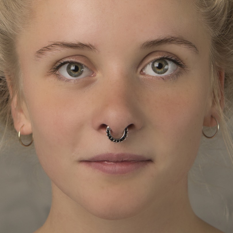 Excelente joya para el piercing en el septum: una joya clásica sin ser aburrida. Esta joya para el piercing en el septum está repleta de bonitos brillantes en todo lo largo de su borde de 3 mm de grosor. Hay un total de 11 brillantes en esta pequeña joya, que además están tallados de la misma forma que los brillantes. Esta talla tan especial permite que la luz se refleje en ellos desde todos los ángulos, y por este motivo se trata de una joya sin igual.