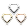 El precioso diseño curvo de esta joya nos recuerda al de una V roma. Ambos costados de la V están repletos de brillantes que le dan un aspecto clásico. La barra que atraviesa tu piercing está hecha en acero quirúrgico, mientras que el resto del diseño está hecho en latón. Posteriormente, estas joyas han sido sometidas a un tratamiento de color, de modo que puedes elegirlas en tres tonos distintos.