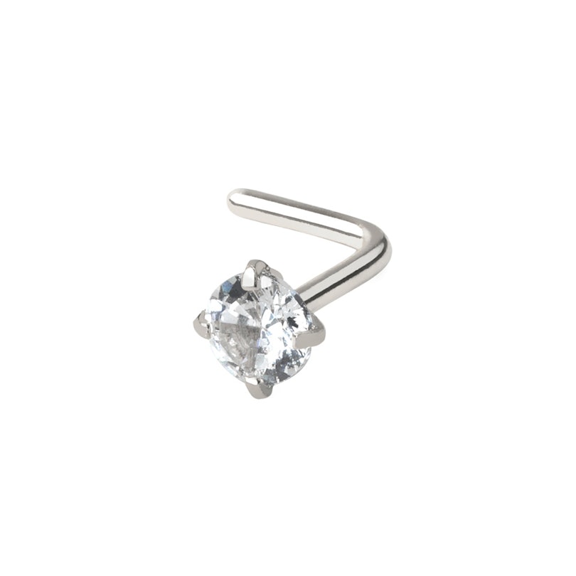 La estructura de esta joya tiene forma de "L", la cual permitirá una buena sujeción a tu piercing sin riesgo de que se caiga. El tamaño de la barra es igual en todas sus versiones: 0,8 mm de grosor y 6 mm de longitud. El tamaño de la circonita puede oscilar entre los 2,5 y los 3 mm, en función del modelo que elijas. Por último, cabe decir todas ellas están hechas en acero quirúrgico.