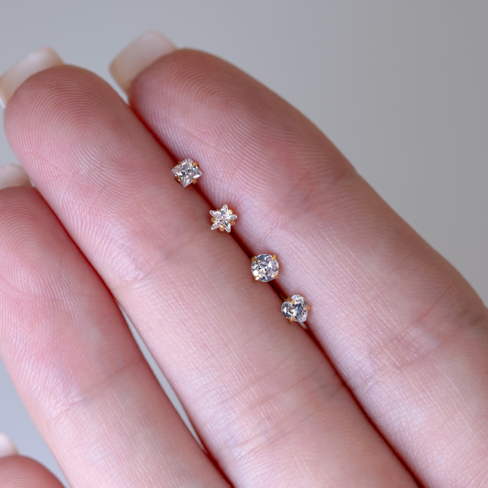 La estructura de esta joya tiene forma de "L", la cual permitirá una buena sujeción a tu piercing sin riesgo de que se caiga. El tamaño de la barra es igual en todas sus versiones: 0,8 mm de grosor y 6 mm de longitud. El tamaño de la circonita puede oscilar entre los 2,5 y los 3 mm, en función del modelo que elijas. Por último, cabe decir todas ellas están hechas en acero quirúrgico.