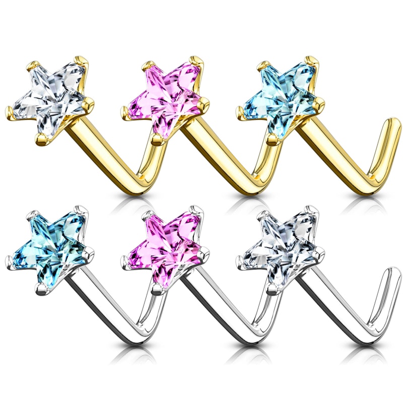 Brilla como las estrellas con esta bonita y femenina joya para la nariz, y su precioso brillante en forma de estrella. El brillante está tallado por múltiples lados, por lo que cuando la luz se refleja en él, hace que brille enormemente. De hecho, el brillante tiene la misma forma que los diamantes en el mundo de la joyería. Además puedes elegirlo en tres colores distintos: el color claro es fenomenal si estás buscando un look clásico, el rosa acentuará el aspecto femenino de la joya, y el turquesa le dará a tu look un aire fresco y muy especial.