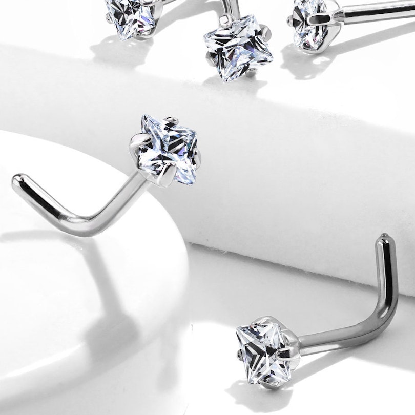 También podrás elegir entre múltiples diseños de piedras para tu nuevo piercing nasal. Una de las opciones es una bella piedra de color claro y en forma triangular.