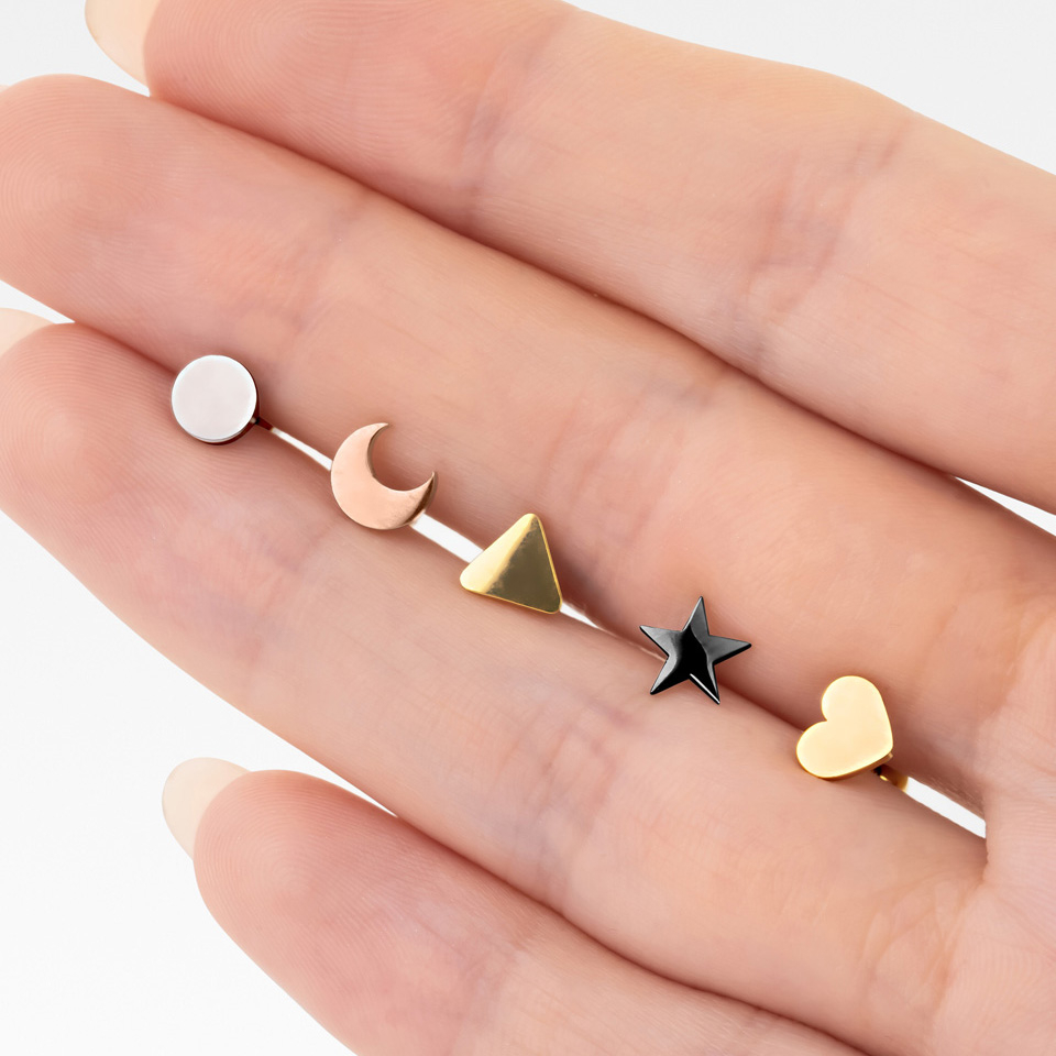 Pedí varias cosas (corazón, media luna, disco, estrella) en colores negro, gris y que cambian de color. Debido a la opinión de E52ter, estaba un poco nervioso por la estrella (la llevo en el lóbulo como lobe), que me pincharía, pero afortunadamente nunca me ha pinchado, no me presiona mientras duermo, así que estoy muy contento con ellas, es fácil ponerlas y quitarlas, estoy completamente satisfecho.