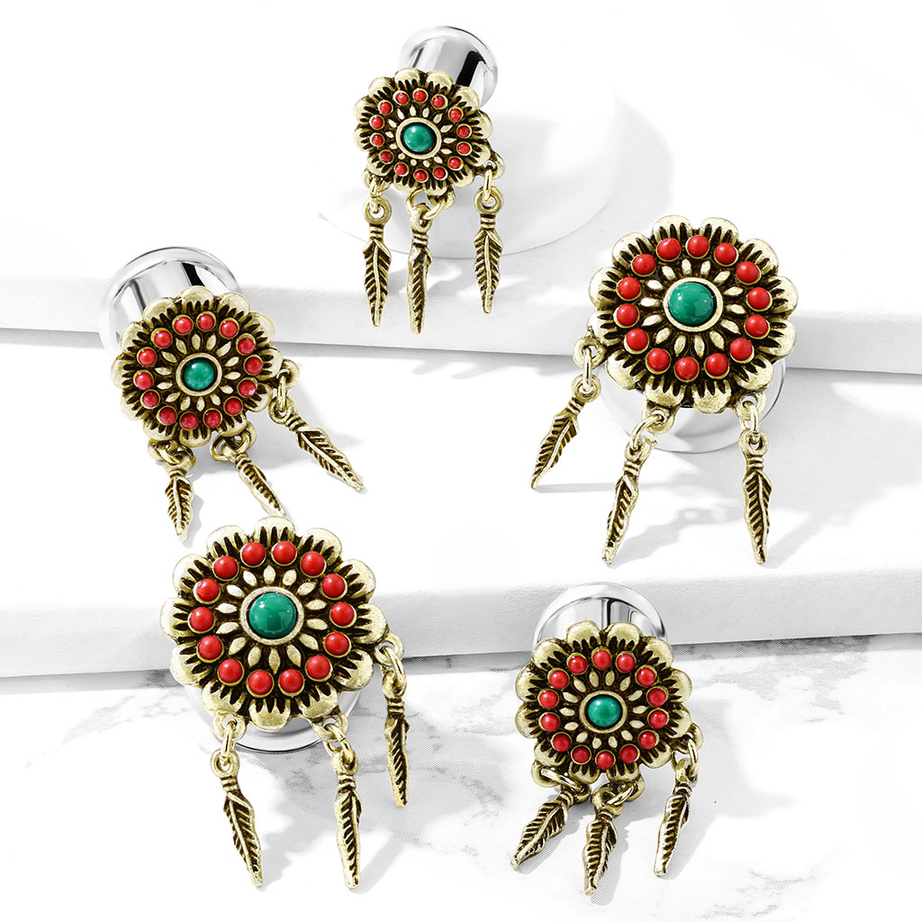 El plug es de acero quirúrgico y está disponible en varios tamaños diferentes. El modelo más pequeño es de 6 mm y el más grande es de 16 mm. La flor de la parte frontal del plug es de latón y tiene un chapado en hoja de oro que le da un look antiguo a la joya.